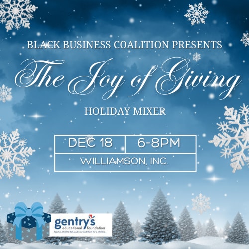 Celebrate the season with the Black Business Coalition at our annual Holiday Party — an evening of connection, music, and holiday cheer. Guests will enjoy a catered dinner by Kei’z Kitchen (courtesy of an anonymous donor), festive cocktails sponsored by Morton Properties LLC and Steps Ahead (Shenita and Carlos Baker), and décor sponsored by Gentry Investment Properties, LLC, Morton Properties LLC and Rosebud Event Decor.