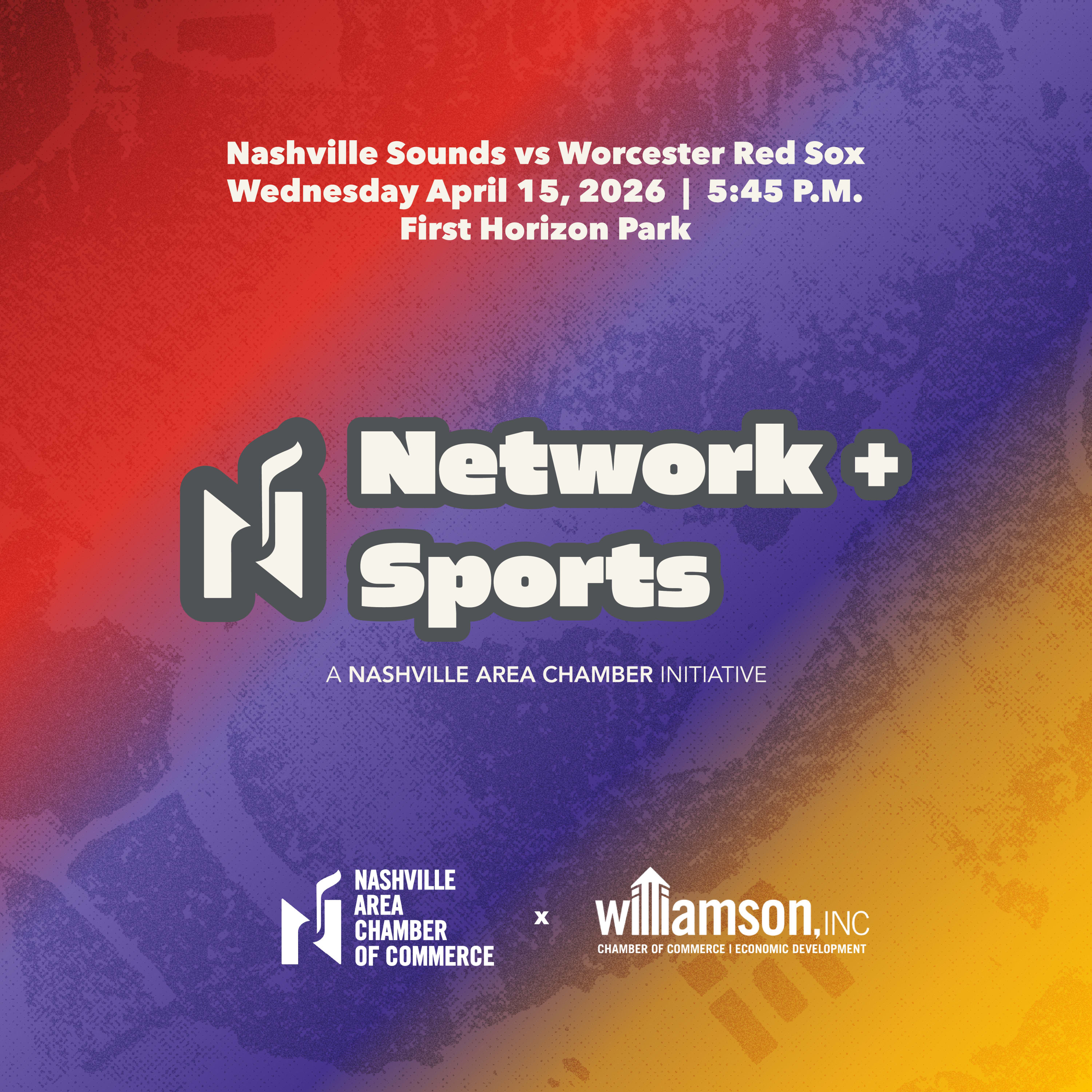 Step up to the plate for an exciting evening of connection, collaboration, and baseball as the Nashville Area Chamber and Williamson Inc. team up for a special Network + Sports edition at the ballpark.This joint event brings together professionals from across both organizations for a unique opportunity to cross-network, build new relationships, and strengthen regional connections while enjoying America’s favorite pastime. As the Nashville Sounds take on the Worcester Red Sox, attendees will mix and mingle in a climate-controlled hospitality party tent, providing the perfect space for relaxed networking before and during the game.Your ticket also includes reserved seating along the first base line (Sections 122–124), conveniently located next to the Band Box, so you won’t miss any of the action on the field. Plus, enjoy an all-you-can-eat picnic with soda and water during a two-hour service window.Whether you’re looking to expand your network, connect with fellow Chamber members from across the region, or simply enjoy a summer evening at the ballpark, Network + Sports: Business in Baseball is the perfect place to do it.Come for the connections. Stay for the game.